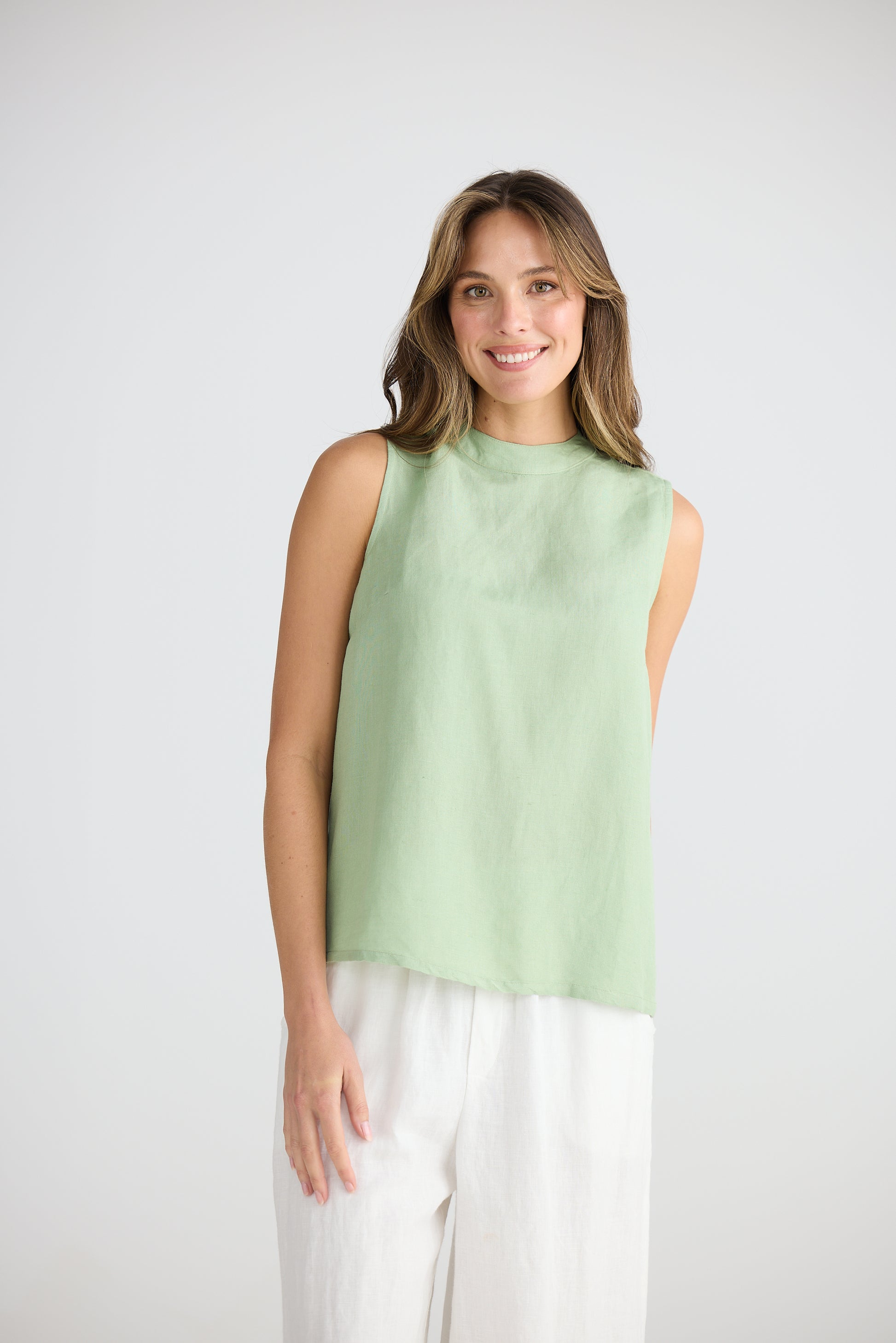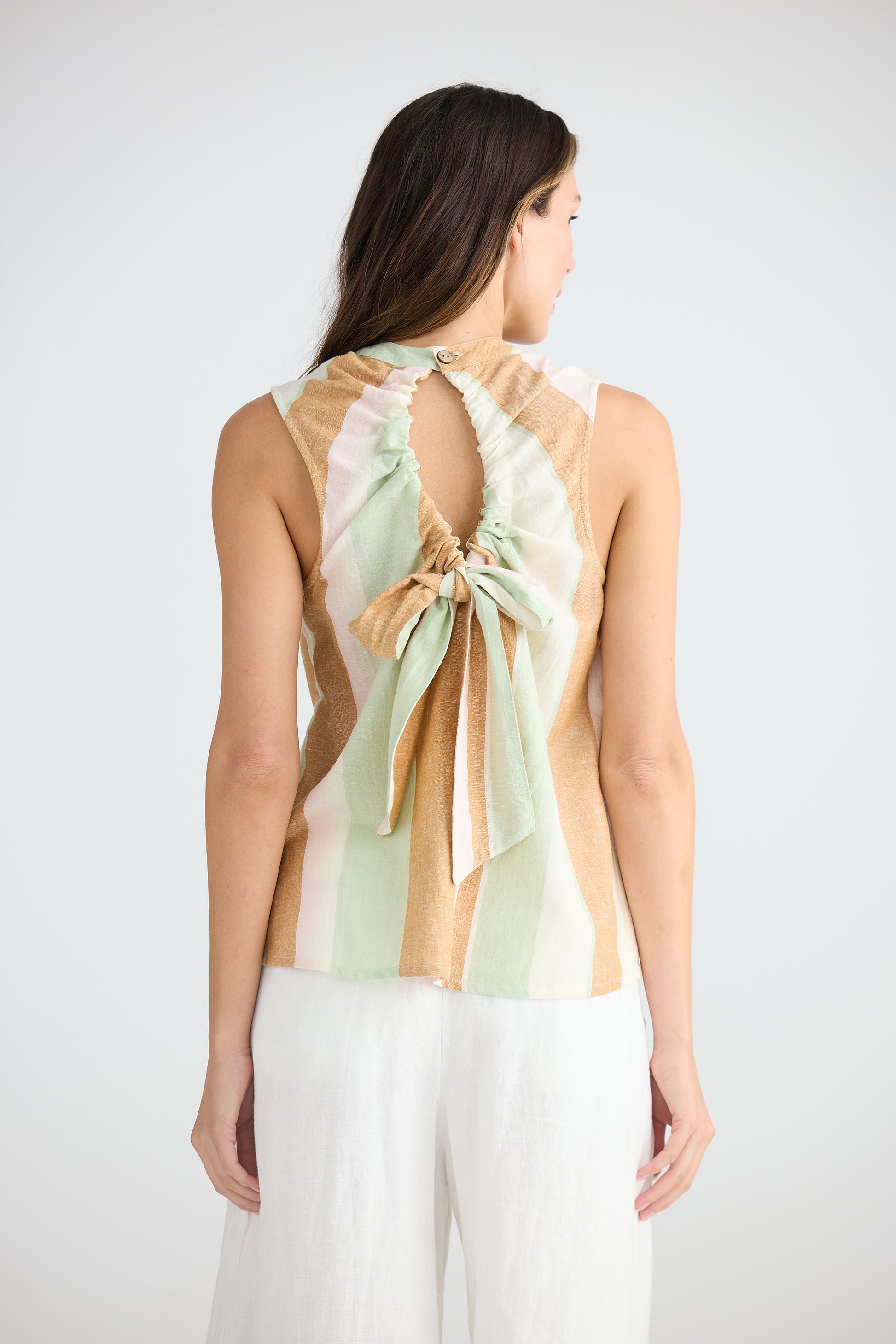 The sleek and modern Adel Top combines a regular fit with a high neckline and sleeveless design. The gathered and adjustable back tie with keyhole adds a touch of versatility and customisation to this top. Stay comfortable and stylish in any situation.