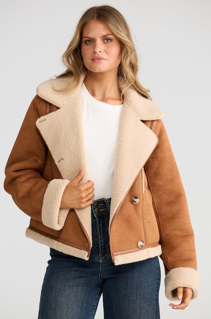 Long Sleeve With Sherpa Cuffs, Collar And Hem Side Pocket Button Through Centre.