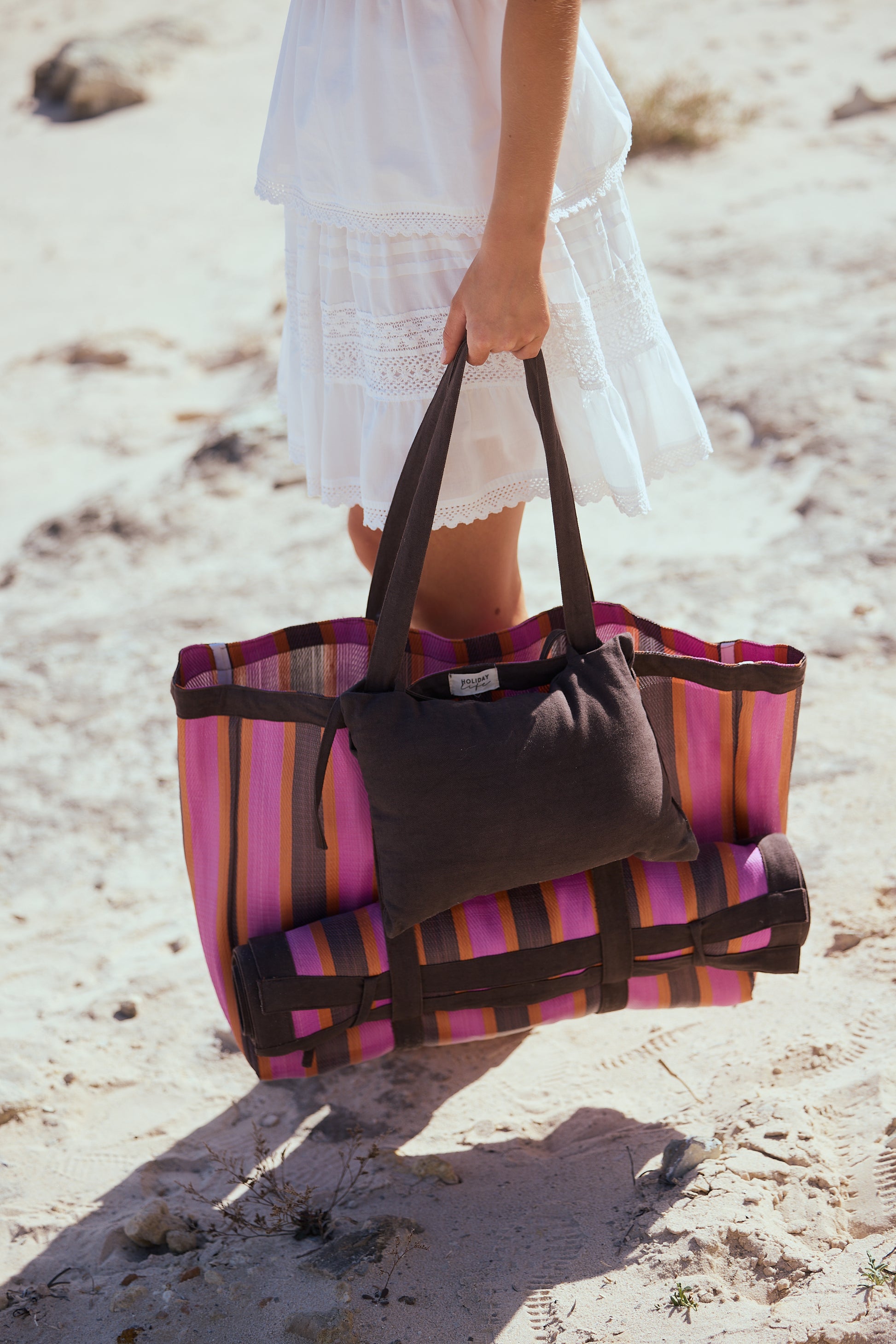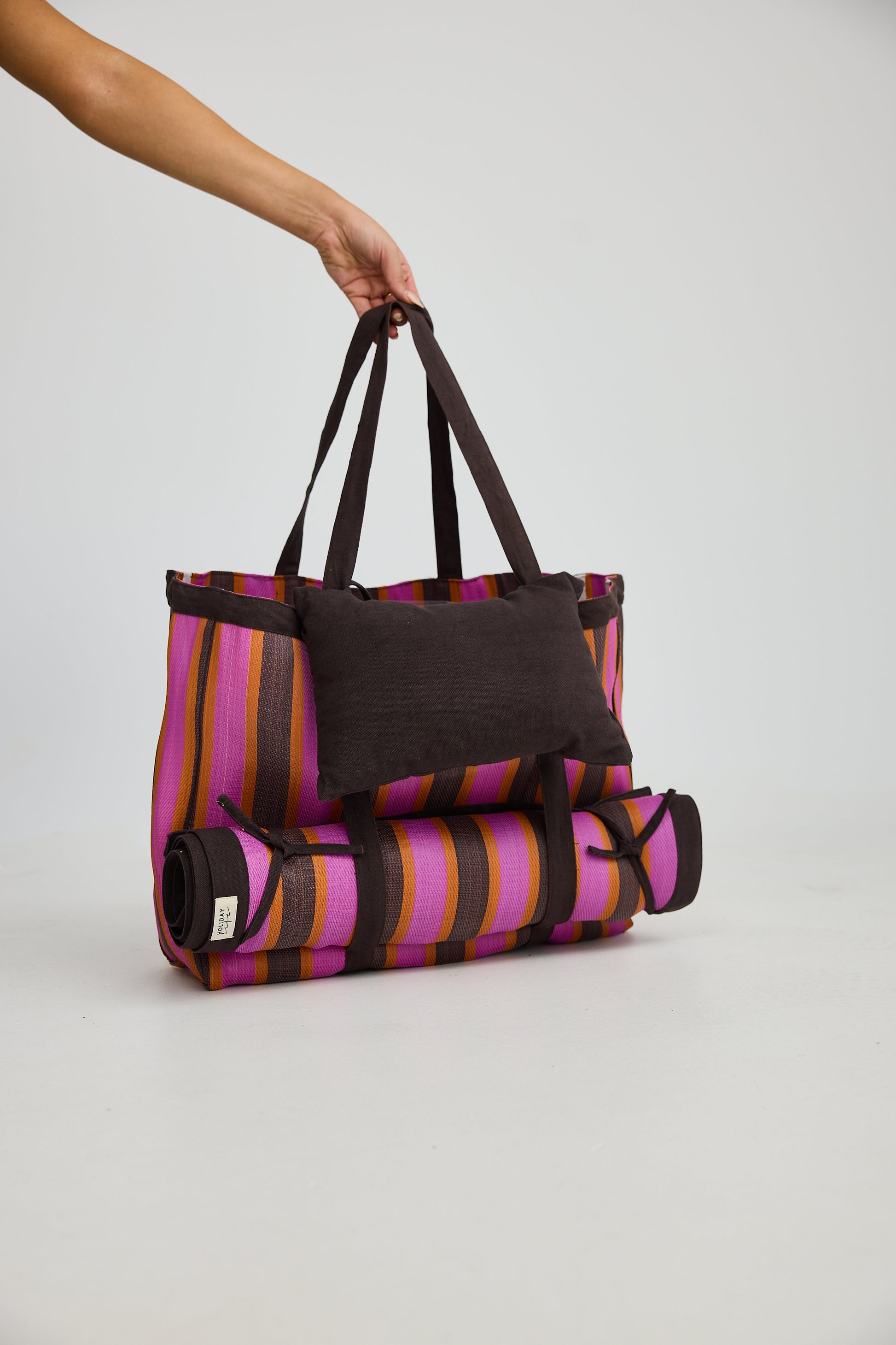 • Striped beach bag set with matching mat and pillow
